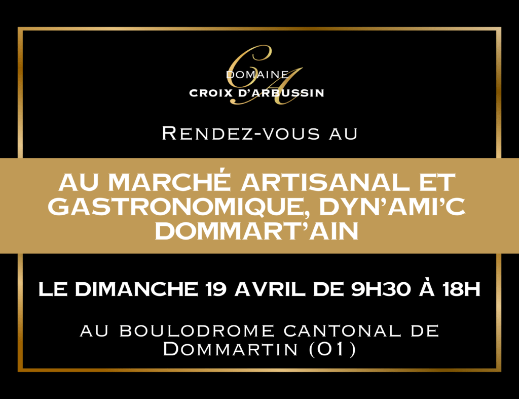 Nous avons le plaisir de vous informer que le Domaine Croix d’Arbussin sera présent au marché artisanal & gastronomique de Dommartin (01), qui se tiendra le dimanche 19 avril au boulodrome. 🕘 Horaires : de 9h30 à 18h 🎟 Entrée gratuite 🛍️ Plus de 50 artisans présents 🍴 Buvette et petite restauration sur place Une belle […]